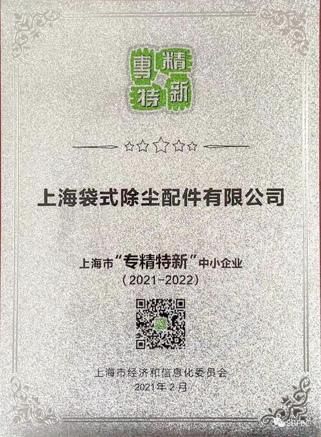为贯彻落实中共中央、国务院《关于促进中小企业健康发展的指导意见》和上海市委、市政府《关于全面提升民营经济活力 大力促进民营经济健康发展的若干意见》,引导中小企业走专业化、精细化、特色化、新颖化发展之路,经上海市专家评审和综合评估,上海袋式除尘配件有限公司荣获上海市“专精特新”中小企业荣誉称号。